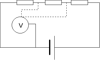 VersuchsdurchführungDer Stromkreis wird mit 3-5 Widerständen in Reihe geschalteten Widerständen aufgebaut, das Netzgerät wird auf eine Spannung von 10V eingestellt. Der eine Anschluß des Voltmeters wird mit dem Minuspol der Spannungsquelle verbunden, der andere nacheinander mit allen Fix-Punkten in der Schaltung. Das Voltmeter zeigt nun den Wert des Potential dieses Bereichs an. Der theoretische Wert wird wie oben beschrieben berechnet und mit dem Meßwert verglichen. |